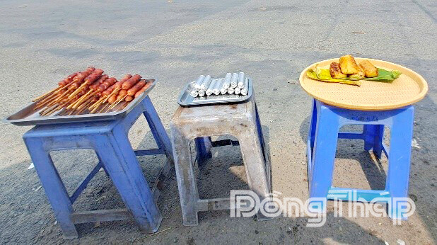 Tương tự, trên một tuyến đường gần trường học tại xã Đốc Binh Kiều, chị O. bán lưu động các món như: Hột gà nướng, bò lụi, xúc xích, nem, chuối nướng.