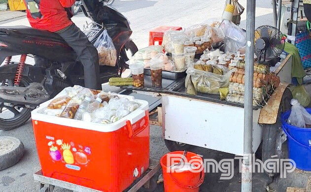 Tại một tuyến đường ở xã Tháp Mười, chị N. dùng xe máy làm phương tiện bán hàng lưu động. Trên yên xe, chị gắn thêm một tấm sàn nhỏ, đặt mâm để bày bán bánh tráng trộn trước cổng một trường học trên địa bàn.