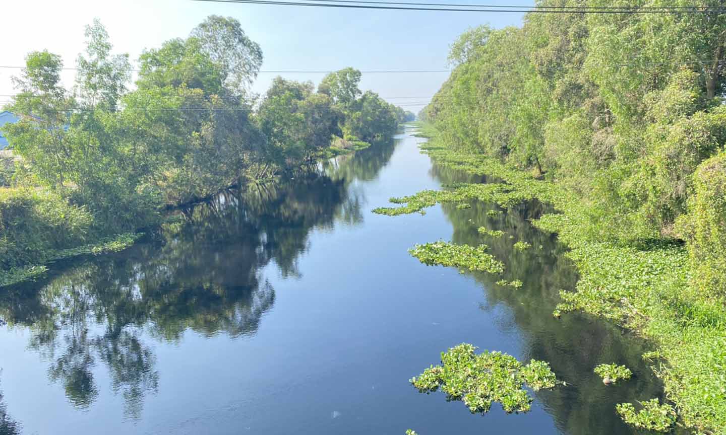 | Đoạn kinh Trương Văn Sanh hướng nhìn từ cầu Trương Văn Sanh về trung tâm thị trấn Mỹ Phước nước có màu đen (ảnh bạn đọc cung cấp). |