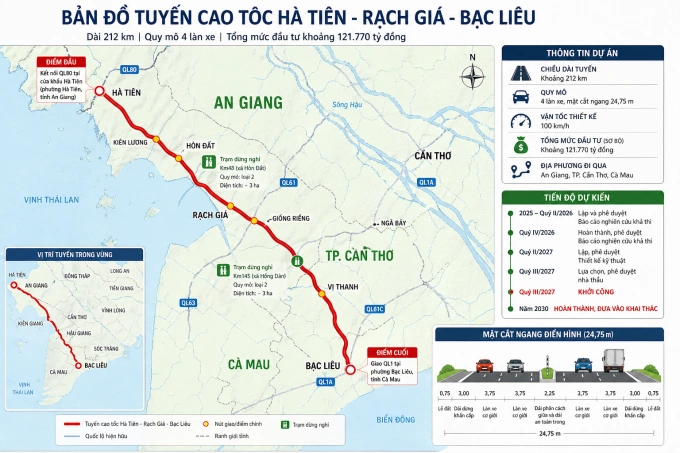Ban Quản lý dự án Mỹ Thuận đề xuất Bộ Xây dựng đầu tư tuyến cao tốc Hà Tiên - Rạch Giá - Bạc Liêu dài 212 km, quy mô 4 làn xe, tổng vốn 121.770 tỷ đồng.
