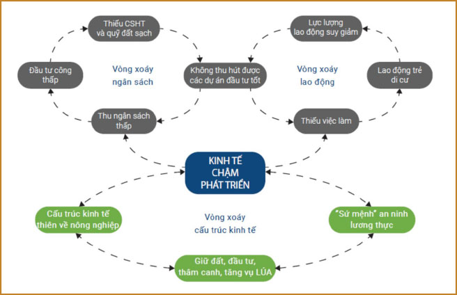 ĐBSCL đang đối diện với ít nhất ba vòng xoáy đi xuống, bao gồm “vòng xoáy ngân sách”, “vòng xoáy lao động” và “vòng xoáy cấu trúc kinh tế”. Hai vòng xoáy về ngân sách (đầu tư) và lao động gắn kết chặt chẽ với vòng xoáy thứ ba về “cơ cấu kinh tế”. Trên thực tế, chính vòng xoáy thứ ba này là căn nguyên của hai vòng xoáy trên.