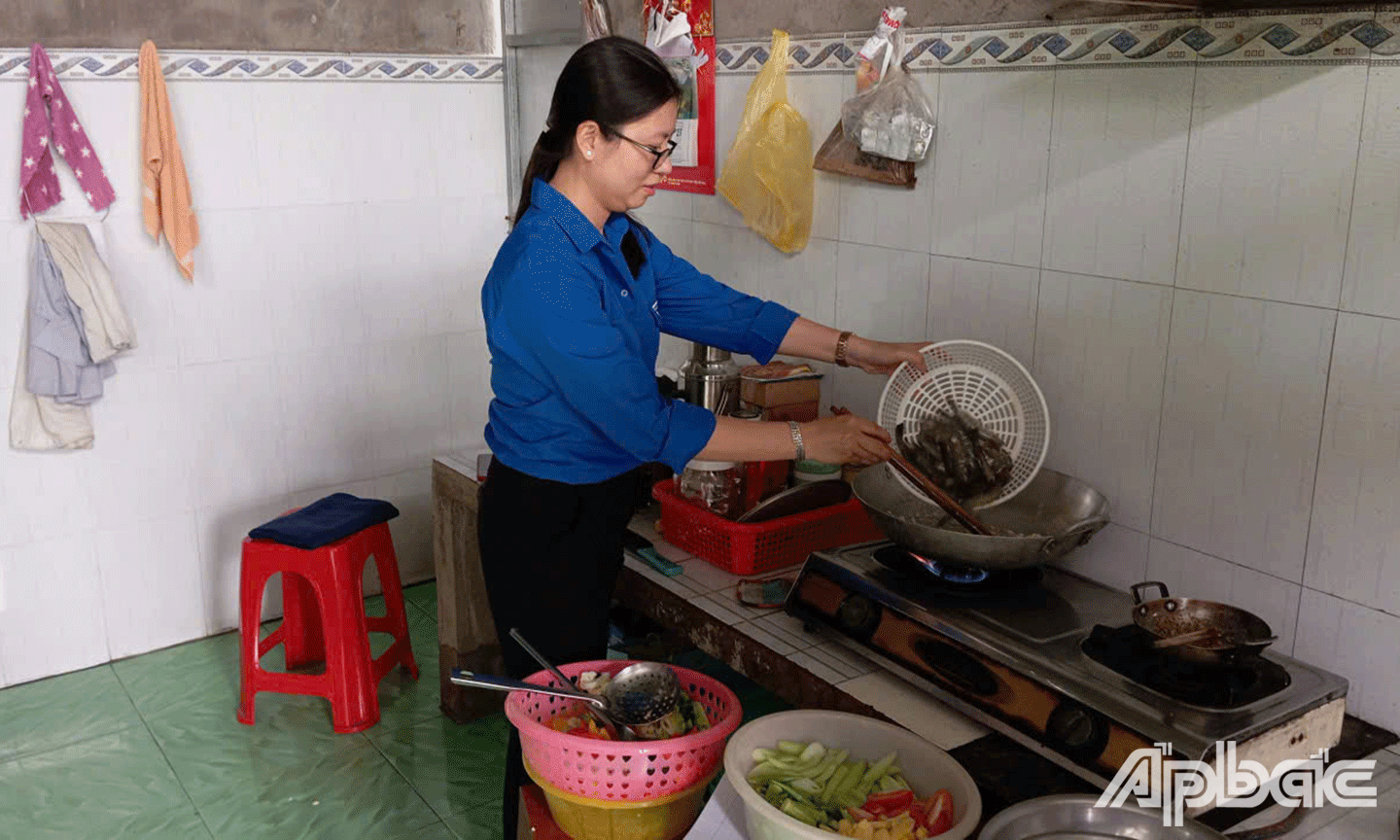 | Đoàn viên, thanh niên chuẩn bị bữa cơm tại nhà bác Nguyễn Thành Vân, gia đình chính sách tại ấp Tân Hòa, xã Tân Dương. |