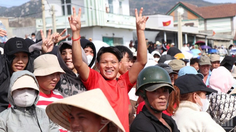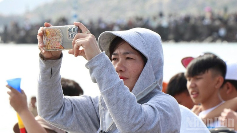 Dưới nắng xuân rực rỡ, bờ biển ken đặc người. Người già, trẻ nhỏ, du khách thập phương… tất cả hòa chung một nhịp cổ vũ.