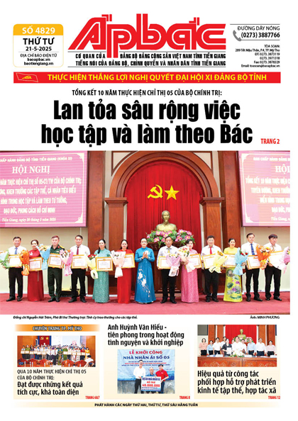 Ngày 20-5, Ban Chấp hành Đảng bộ tỉnh Tiền Giang khóa XI tổ chức Hội nghị Tổng kết 10 năm thực hiện Chỉ thị 05, ngày 15-5-2016 của Bộ Chính trị về đẩy mạnh việc học tập và làm theo tư tưởng, đạo đức, phong cách Hồ Chí Minh (gọi tắt là Chỉ thị 05) và biểu dương, khen thưởng tập thể, cá nhân tiêu biểu, xuất sắc trong học tập và làm theo tư tưởng, đạo đức, phong cách Hồ Chí Minh. Lan tỏa sâu rộng việc học tập và làm theo Bác (xem trang 2).
