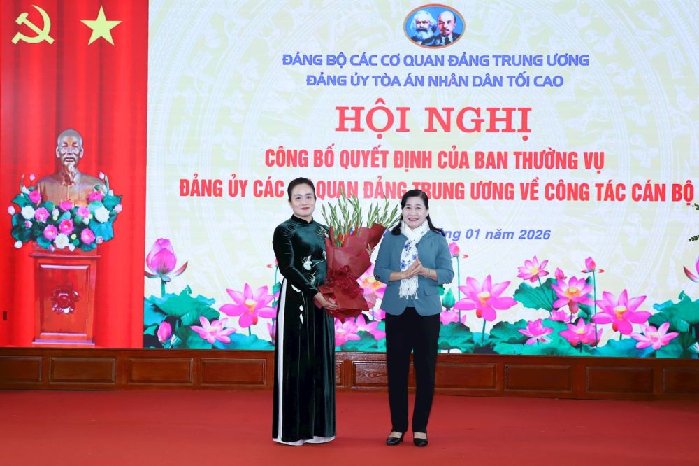 Chiều 5-1-2026, Đảng ủy Tòa án nhân dân tối cao tổ chức Hội nghị công bố Quyết định của Ban Thường vụ Đảng ủy các cơ quan Đảng Trung ương chỉ định đồng chí Nguyễn Hải Trâm tham gia Ban Chấp hành Đảng bộ, Ban Thường vụ và giữ chức Phó Bí thư Thường trực Đảng ủy Tòa án nhân dân tối cao, nhiệm kỳ 2025 - 2030.