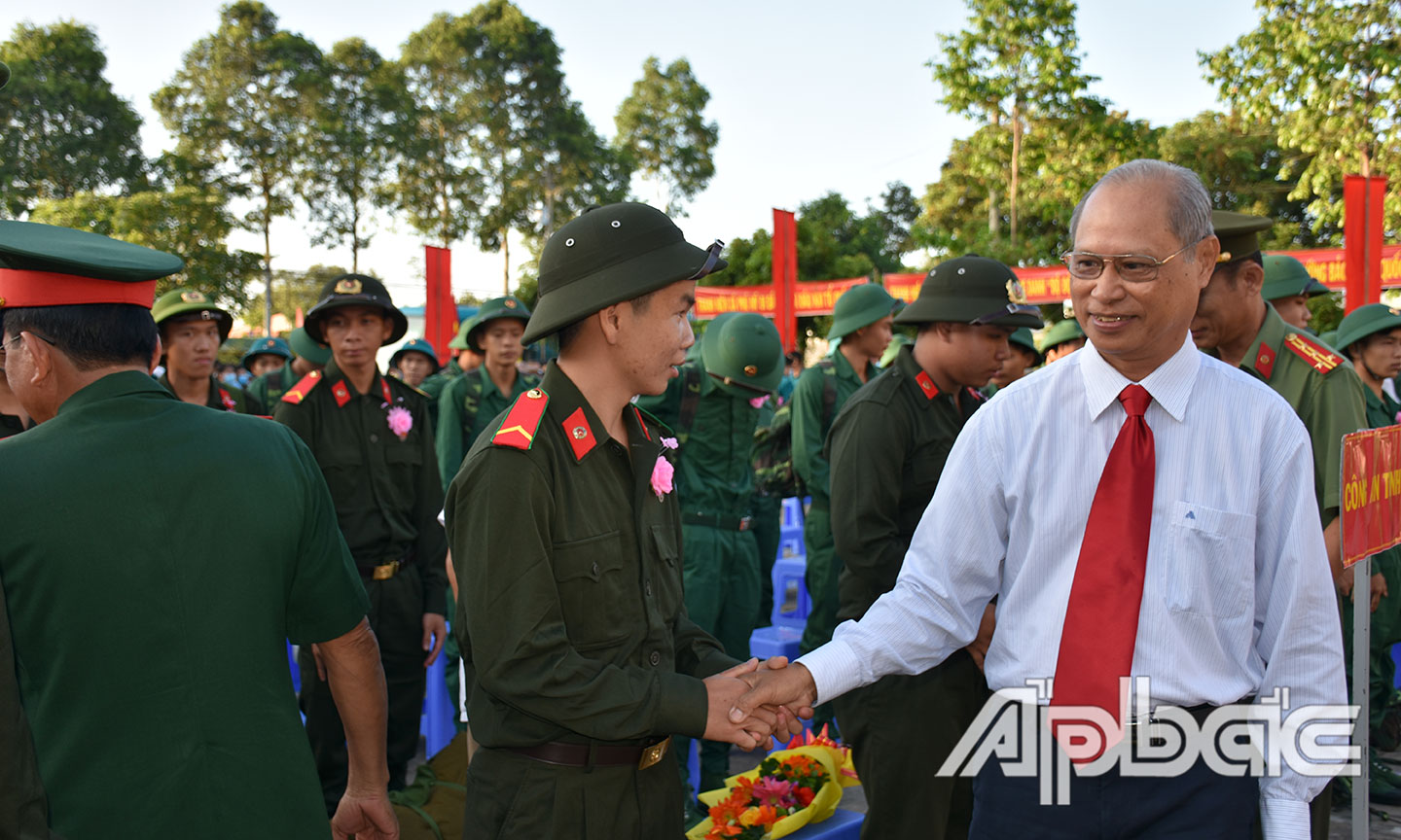 | Đại tá Châu Hoàng Phương, Ủy viên Ban Thường vụ Tỉnh ủy, Chỉ huy trưởng Bộ Chỉ huy Quân sự tỉnh động viên, thăm hỏi thanh niên TP. Mỹ Tho lên đường nhập ngũ. |