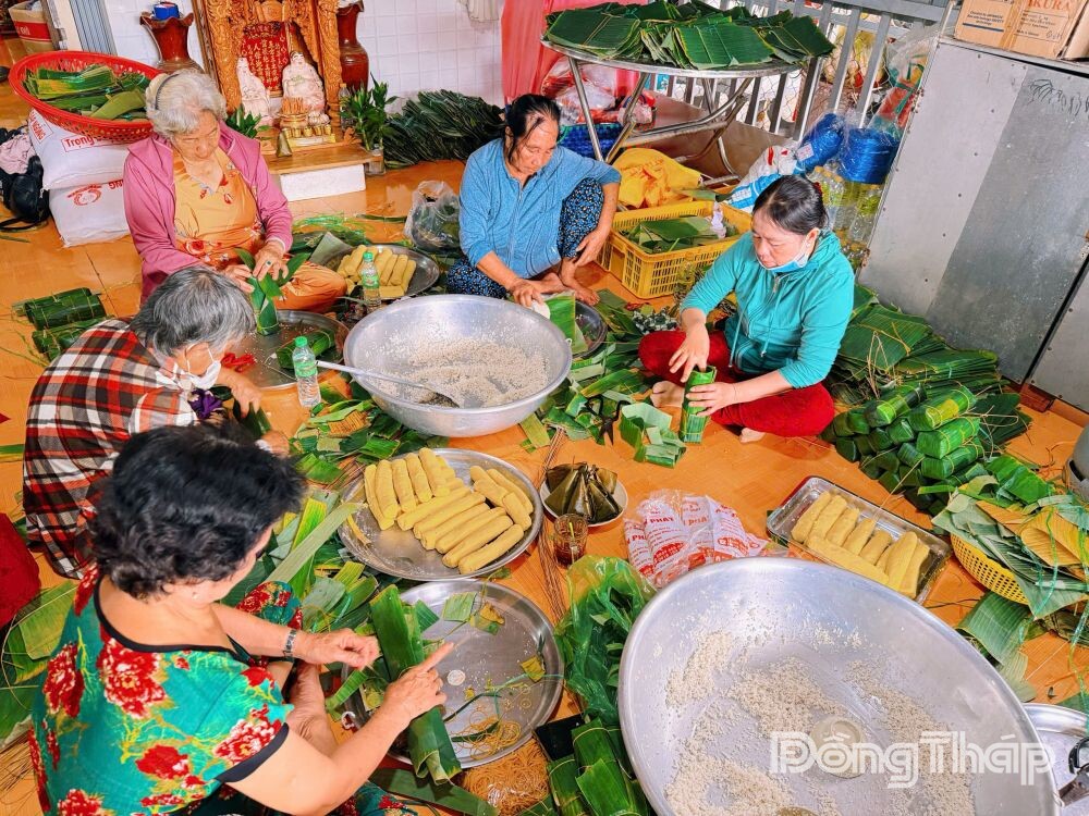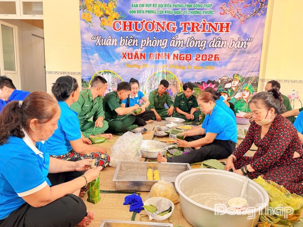 Tại Đồn Biên phòng Cửa khẩu Quốc tế Thường Phước (xã Thường Phước), không khí gói bánh diễn ra vô cùng ấm cúng.