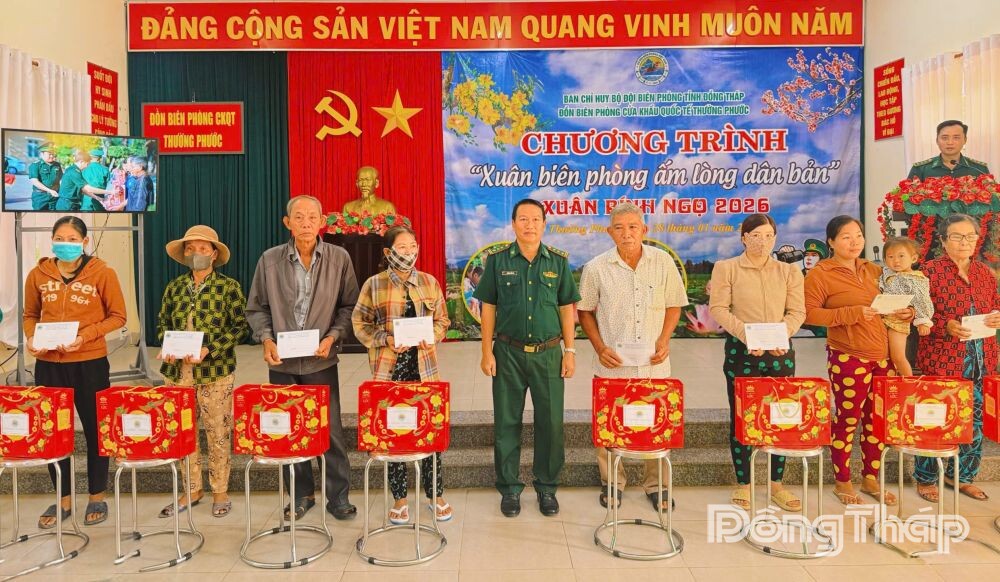 Tại Đồn Biên phòng Cửa khẩu Quốc tế Thường Phước, đơn vị tổ chức trao tặng 150 suất quà tết cho các gia đình chính sách, hộ nghèo, hộ có hoàn cảnh khó khăn.