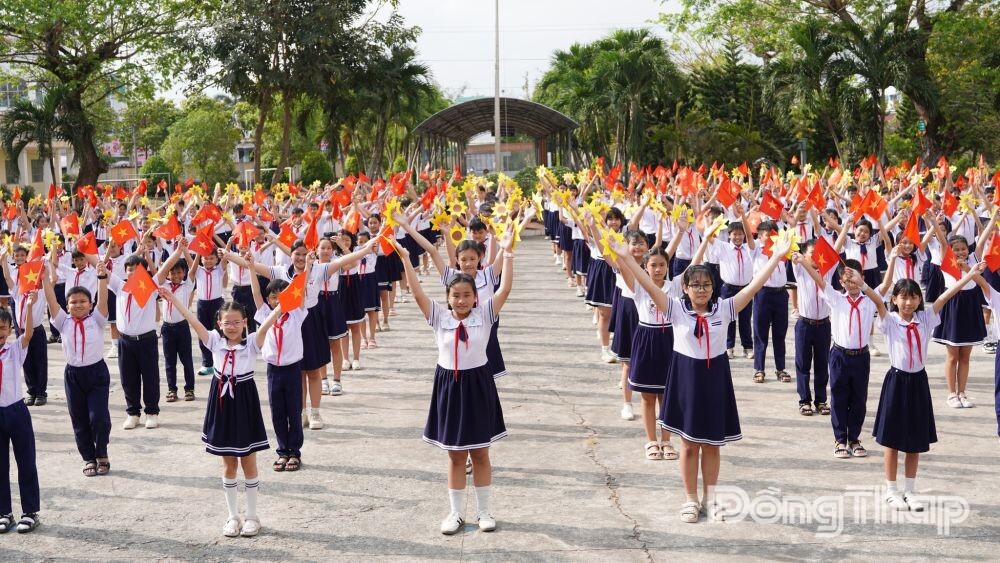 Điểm nhấn của Ngày hội là màn đồng diễn sân trường sôi động của các em đội viên, thiếu nhi, thể hiện tinh thần đoàn kết, khỏe khoắn và khí thế thi đua sôi nổi của thiếu nhi Đồng Tháp.