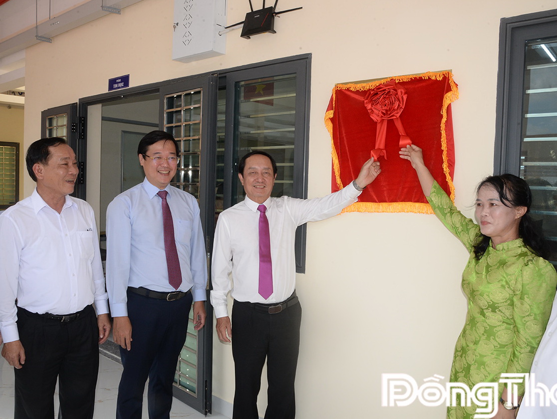 | Đồng chí Lê Quốc Phong, Ủy viên Ban Chấp hành Trung ương Đảng, Bí thư Tỉnh ủy, Trưởng đoàn đại biểu Quốc hội tỉnh Đồng Tháp trao tặng Phòng thực hành giáo dục STEM cho nhà trường. |