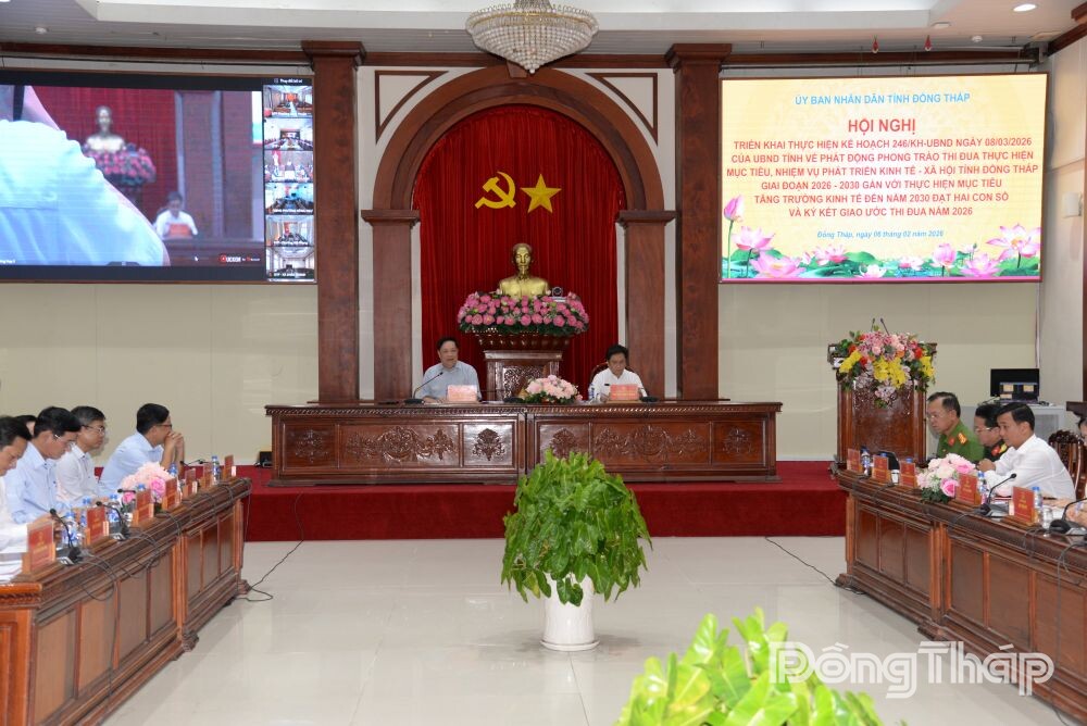 (ĐTO) Chiều 7-4, UBND tỉnh Đồng Tháp tổ chức Hội nghị triển khai thực hiện Kế hoạch 246/KH-UBND ngày 8-3-2026 của UBND tỉnh về phát động phong trào thi đua thực hiện mục tiêu, nhiệm vụ phát triển kinh tế - xã hội tỉnh Đồng Tháp giai đoạn 2026 - 2030 gắn với thực hiện mục tiêu tăng trưởng kinh tế đến năm 2030 đạt 2 con số và ký kết giao ước thi đua năm 2026.