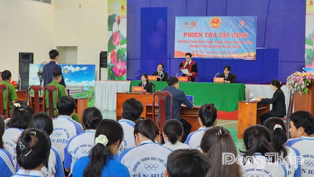 (ĐTO) Ngày 1-2, tại Trường THPT Tân Hiệp, Ban Thường vụ Tỉnh đoàn Đồng Tháp phối hợp với Tòa án nhân dân tỉnh, Viện Kiểm sát nhân dân tỉnh tổ chức Phiên tòa giả định tuyên truyền pháp luật cho đoàn viên, thanh thiếu niên năm 2026.