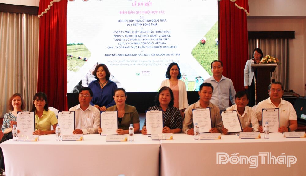 (ĐTO) Sáng 21-4, diễn ra Lễ ký kết Chương trình phối hợp thúc đẩy bình đẳng giới và hòa nhập người khuyết tật trong triển khai Dự án “Chuyển đổi chuỗi giá trị lúa gạo ứng phó với biến đổi khí hậu và phát triển bền vững khu vực Đồng bằng sông Cửu Long” (gọi tắt là Dự án TRVC) giữa Sở Nông nghiệp và Môi trường, Sở Y tế và Hội Liên hiệp Phụ nữ tỉnh Đồng Tháp; giữa Sở Y tế, Hội Liên hiệp Phụ nữ tỉnh Đồng Tháp và các doanh nghiệp tham gia Dự án.