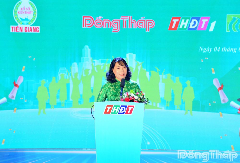 Editor-in-Chief of Dong Thap Press and Radio, Television Ngo Thi Ngoc Hanh expressed her sincere appreciation to former Member of the Party Central Committee Tran Thi Kim Cuc; leaders of provincial departments and agencies; and Tien Giang Lottery One-Member Co., Ltd. for their continued partnership with Dong Thap Press and Radio, Television in carrying out the “Wings of Dreams” scholarship program.