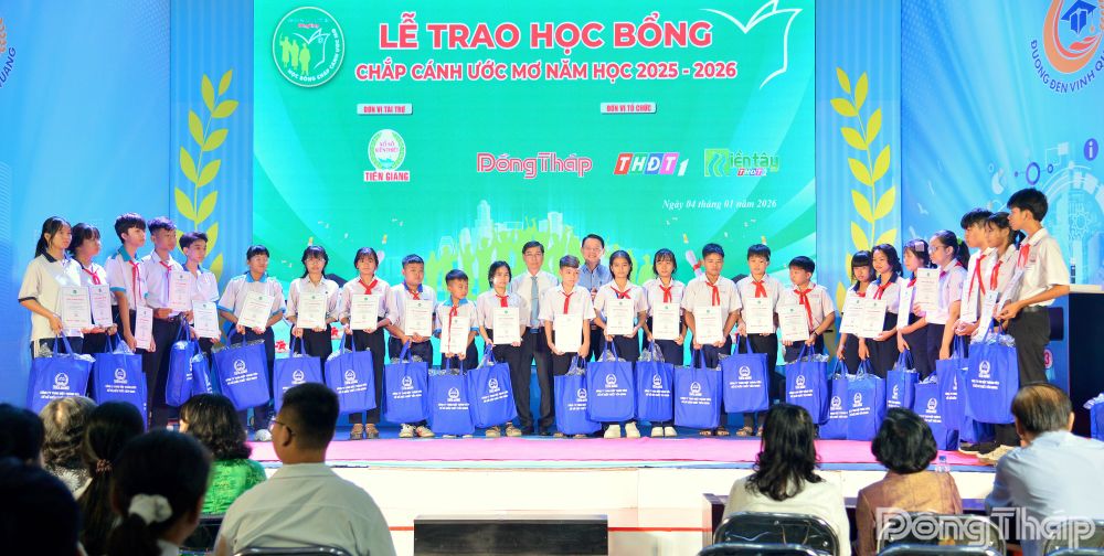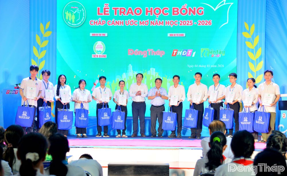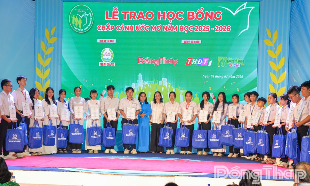 (DTO) On the morning of January 4, the Dong Thap Press and Radio, Television, in coordination with Tien Giang Lottery One-Member Co., Ltd. and other partners, held the award ceremony for the 2025-2026 “Chap Canh Uoc Mo” (Wings of Dreams) scholarship program.