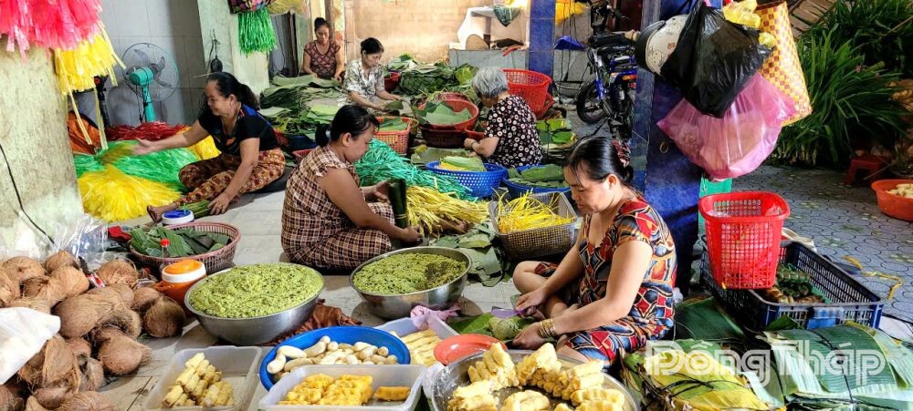 Alongside rice noodle and hu tieu workshops, banh tet (cylindrical sticky rice cakes) producers in the My Phong craft village are also operating at maximum capacity.