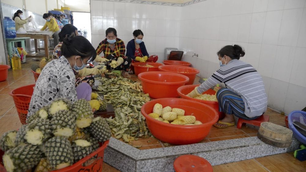 Tan Phuoc currently boasts over 16,000 hectares of pineapple cultivation, yielding an annual output of more than 260,000 tonnes.Through diligence, creativity, and the adoption of VietGAP standards and modern farming techniques, local farmers have achieved exceptional yields and fruit quality.At harvest, pineapples are tossed into field canals to be floated downstream, a clever method to streamline collection.The fruit is then gathered onto sampans and transported to collection points to await wholesalers. With traders purchasing directly at the farm, prices have remained stable at VND 7,000–10,000 per kg in recent years, ensuring a prosperous income for farmers. Beyond fresh produce, second-grade pineapples are used to craft the region’s renowned pineapple jam. Photo: Pre-processing pineapples at a local jam facility.The delicious Tan Phuoc jam is a favorite among consumers nationwide, adding to the legendary "sweetness of acid sulfate soil" that defines the region's specialty.