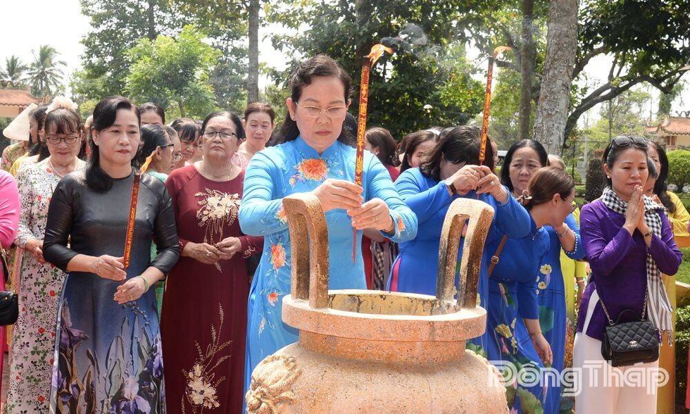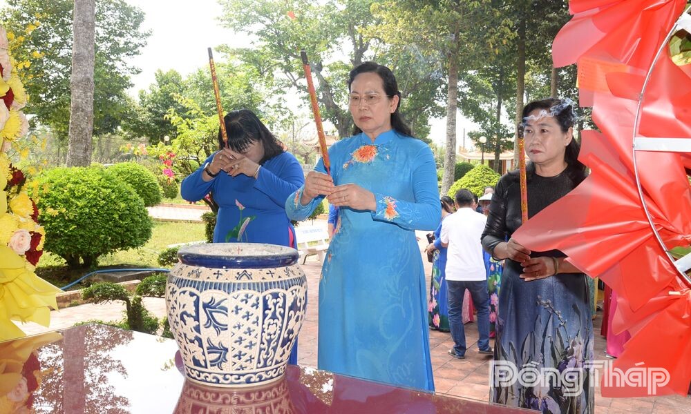 (DTO) On the afternoon of March 20, Ms. Le Thi Thuy, Member of the Party Central Committee, Standing Member of the Party Committee of the Vietnam Fatherland Front and Central mass organizations, Secretary of the Party Committee, and President of the Vietnam Women's Union, led a delegation to offer flowers and incense at the Martyrs' Memorial, Long Hung Communal House, and the Temple of Ms. Nguyen Thi Thap. The delegation also visited the exhibition house at the Nam Ky Khoi Nghia Historical Site (Long Hung Commune).