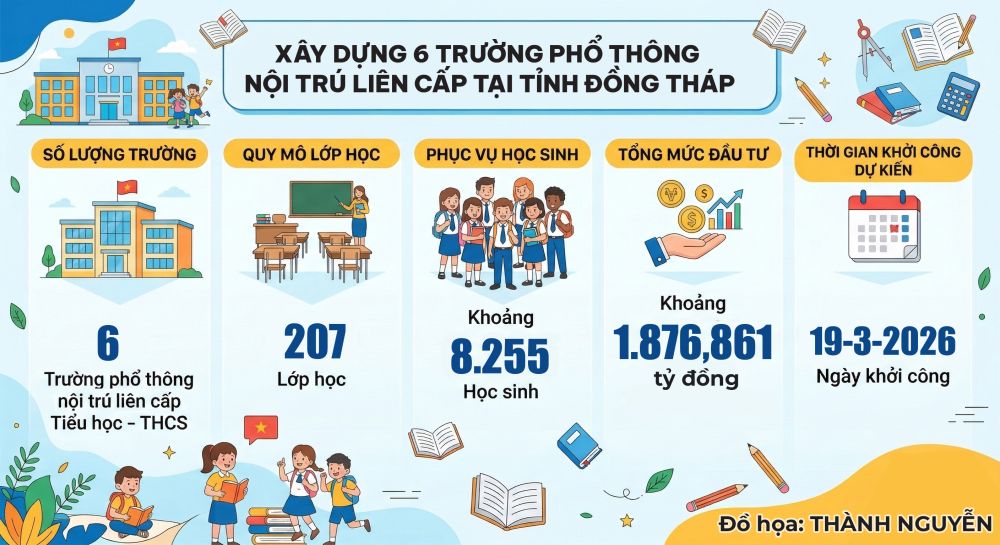 (DTO) Dong Thap Province is mobilizing resources to break ground on inter-level boarding schools (primary to lower secondary) in land border areas. The move aims to bolster the local school network, ensuring stable education for border students and bridging the gap between regions.