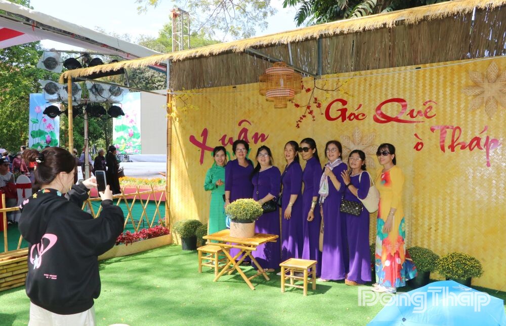 Furthermore, the Provincial Relic Management Board created several beautiful decorative landscapes, such as the "Spring 2026 – Go Thap Countryside Corner" and floral boats. Other activities included calligraphy performances, clothing stalls, and a food court, providing diverse options for visitors to sightsee, take photos, and shop.