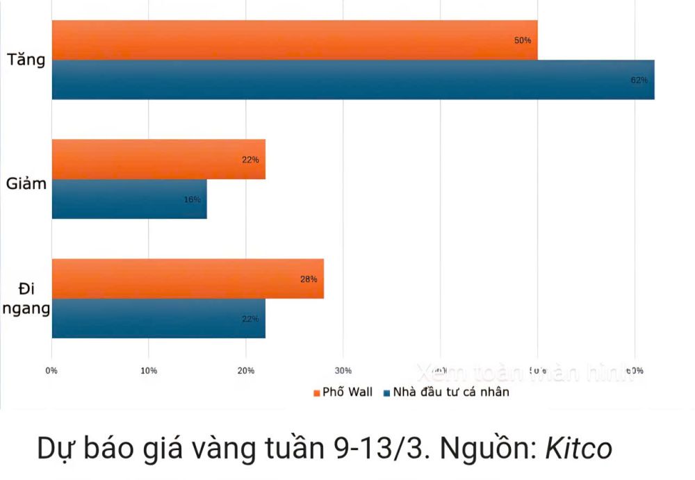 Khảo sát mới nhất của Kitco với 18 nhà phân tích Phố Wall cho thấy diễn biến sắp tới có thể khó lường. Chỉ một nửa, tương đương 9 chuyên gia kiên trì quan điểm lạc quan tuần này. Trong khi 4 người (22%) dự báo giá giảm, còn 5 nhà phân tích cho rằng rủi ro trong ngắn hạn khá cân bằng.