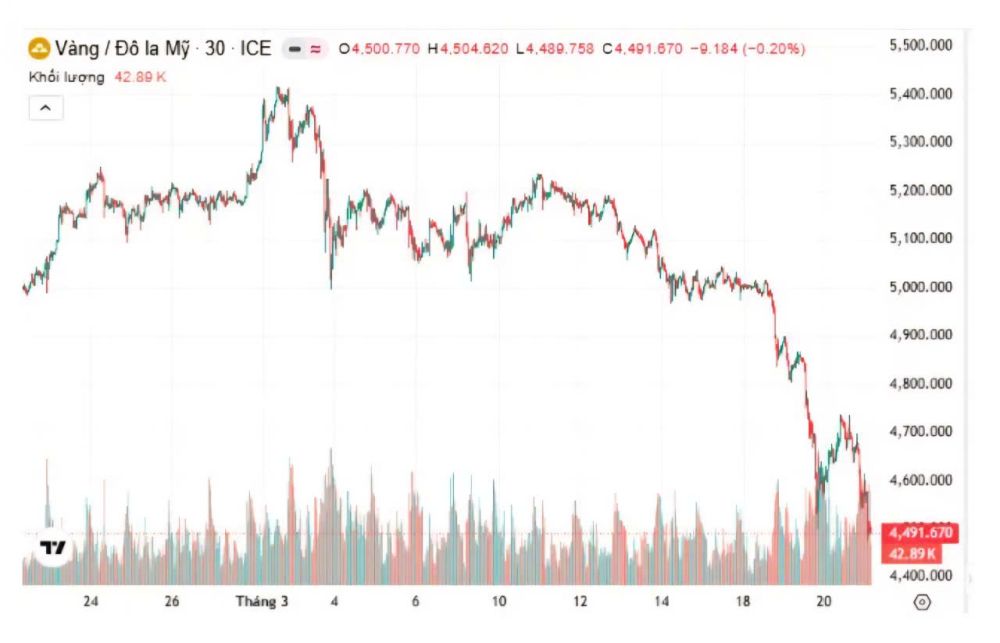 Giá vàng theo đó tiếp tục suy yếu, có thời điểm lùi sát ngưỡng 4.800 USD/ounce trước khi bước vào một đợt giảm sâu hơn trong phiên châu Á ngày thứ năm (19-3). Chỉ trong vài giờ, kim loại quý này rơi từ 4.833 USD xuống còn 4.538 USD/ounce.