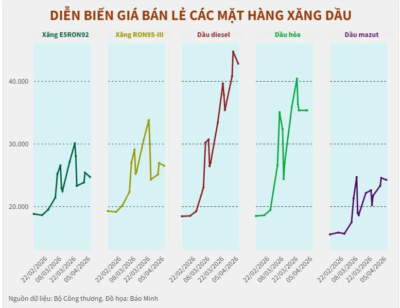 Kỳ điều hành ngày 8/4/2026, liên Bộ Công Thương-Tài chính đã quyết định áp dụng mức thuế mới của thuế bảo vệ môi trường, thuế giá trị gia tăng, thuế tiêu thụ đặc biệt đối với xăng, dầu theo Quyết định số 482/QĐ-TTg ngày 26-3-2026 của Thủ tướng Chính phủ, chi sử dụng Quỹ bình ổn giá xăng dầu theo Quyết định số 757/QĐ-BCT ngày 8-4-2026 của Bộ trưởng Bộ Công Thương về việc áp dụng biện pháp sử dụng Quỹ bình ổn giá xăng dầu, thực hiện điều hành giá xăng dầu trong nước đảm bảo phản ánh đúng xu hướng biến động của giá xăng dầu thế giới.