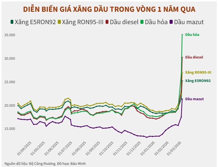 Giá xăng dầu tiếp tục tăng mạnh tại kỳ điều hành ngày 7-3, dầu hỏa vượt mốc 35 nghìn/lít