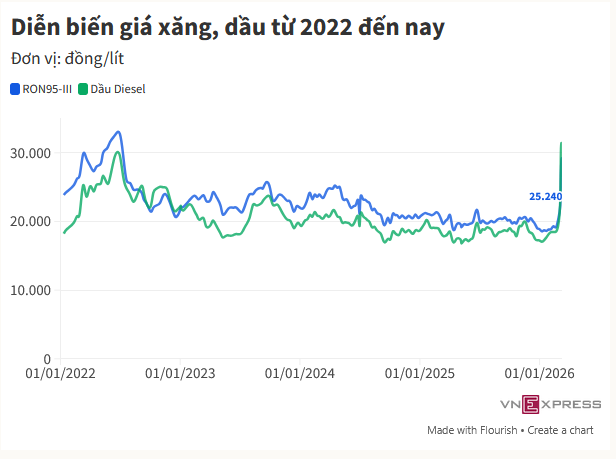 Từ 22h hôm nay, giá xăng RON95-III giảm xuống 25.240 đồng, dầu diesel hạ 4.240 đồng ở mức 26.470 đồng một lít.