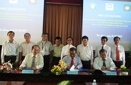 Chiều 21-12, Trường Đại học Tiền Giang ký kết hợp tác đào tạo, nghiên cứu khoa học, sản xuất và cung cấp dịch vụ với Sở NN&PTNN Tiền Giang và hợp tác đào tạo trình độ thạc sĩ chuyên ngành “Rau quả” (Horticulture) với Viện Cây ăn quả miền Nam.