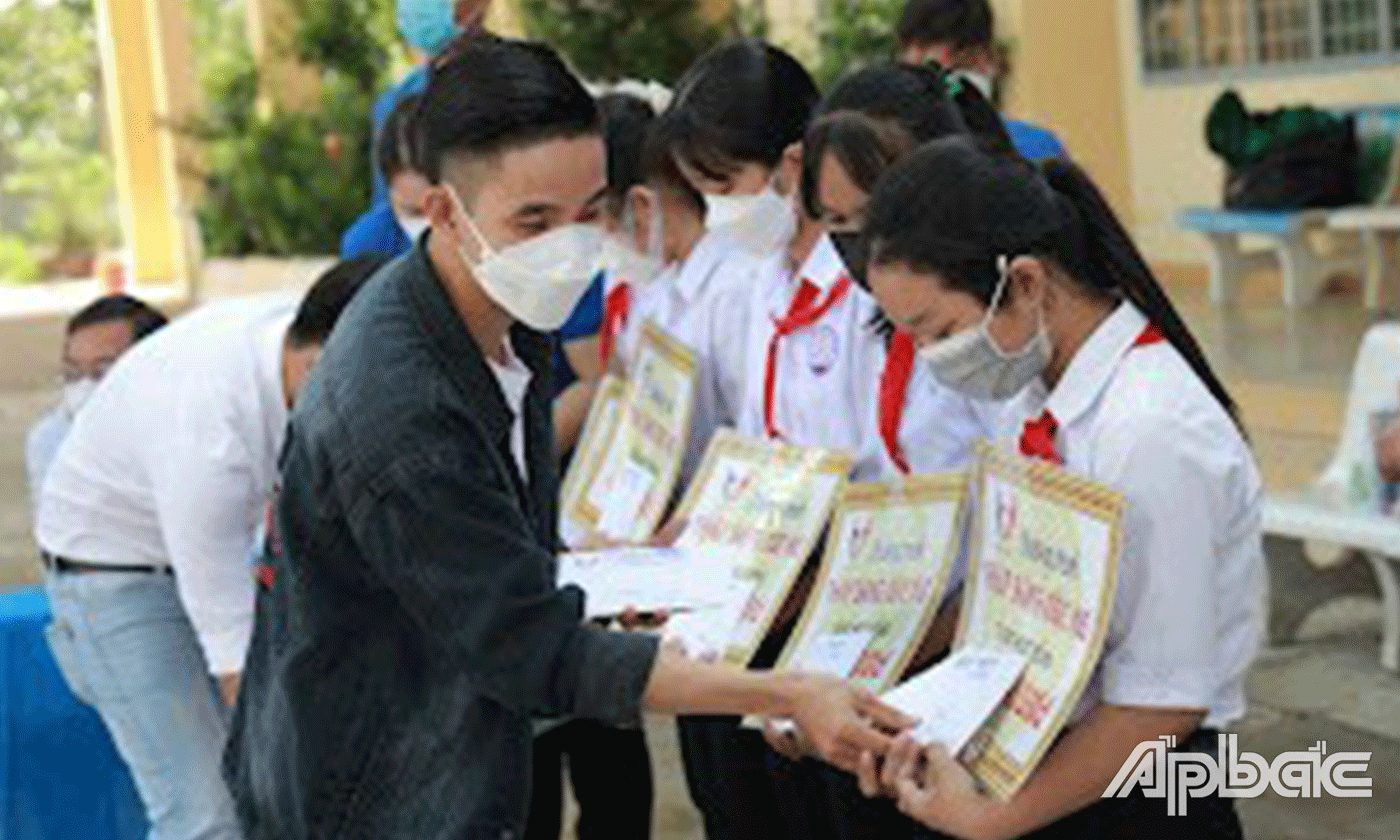 | Diễn viên Trung Cang trao học bổng cho các em học sinh. |