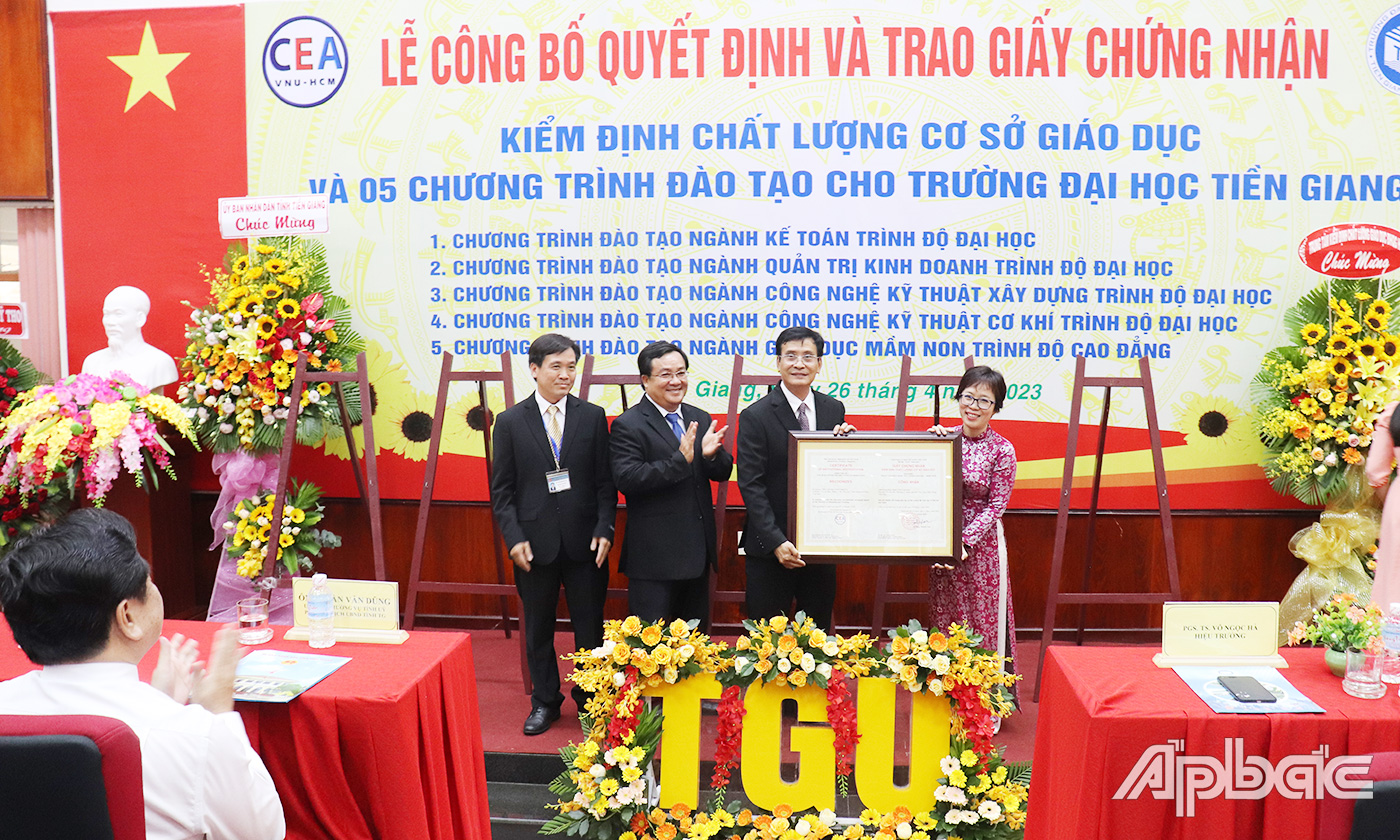 Tại buổi lễ, Trường Đại học Tiền Giang vinh dự nhận Giấy chứng nhận kiểm định chất lượng cơ sở giáo dục theo Bộ tiêu chuẩn của Bộ Giáo dục và Đào tạo theo Quyết định 40/QĐ-TTKĐ ngày 21-3-2023 của Trung tâm Kiểm định chất lượng giáo dục, Đại học Quốc gia TP. Hồ Chí Minh; nhận Quyết định công nhận và Giấy chứng nhận của 5 chương trình đào tạo của trường gồm: Đại học Kế toán, Đại học Quản trị kinh doanh, Đại học Công nghệ kỹ thuật xây dựng, Đại học Công nghệ kỹ thuật cơ khí, Cao đẳng Giáo dục mầm non, do Trung tâm Kiểm định chất lượng giáo dục, Đại học Quốc gia TP. Hồ Chí Minh công nhận.