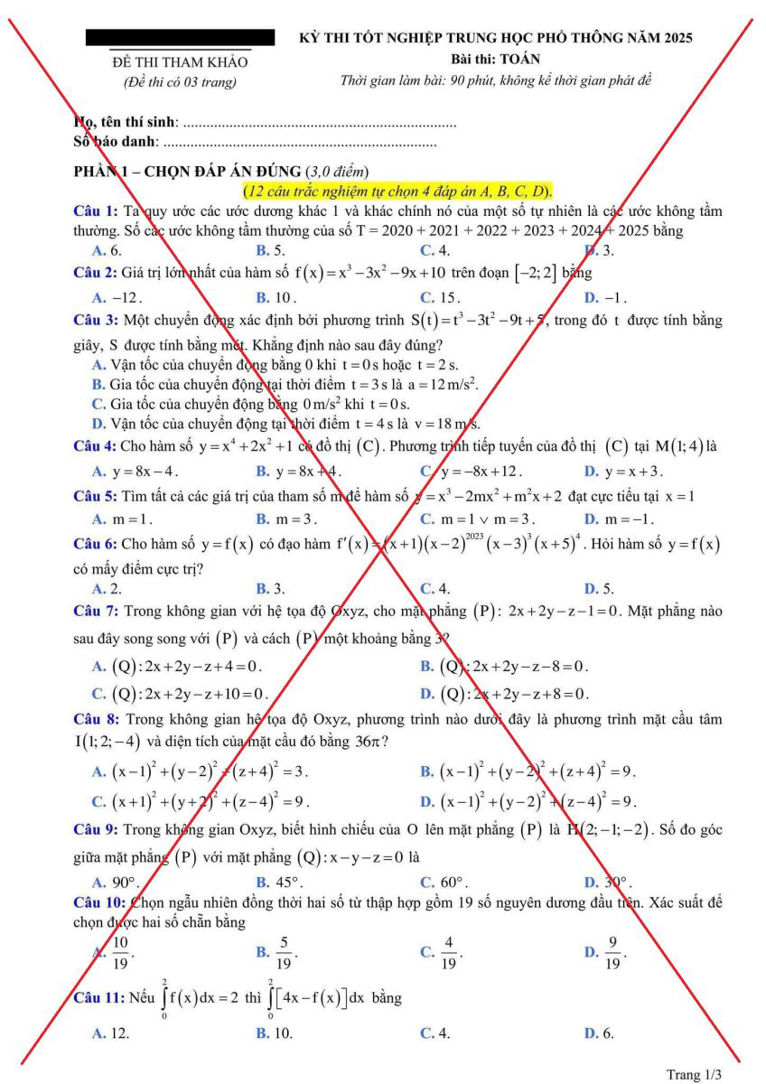 Đề thi môn Toán lan truyền trên mạng không phải đề thi tham khảo Kỳ thi tốt nghiệp Trung học Phổ thông 2025
