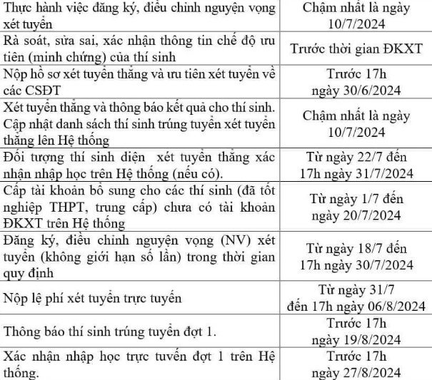 Đối với thí sinh trúng tuyển thuộc đối tượng xét tuyển thẳng, từ ngày 22-7-2024 đến 17 giờ 00 ngày 31-7-2024, thí sinh có thể xác nhận nhập học trên Hệ thống (những thí sinh đã xác nhận nhập học sẽ không được tiếp tục đăng ký NVXT, trừ các trường hợp được thủ trưởng CSĐT cho phép không nhập học).