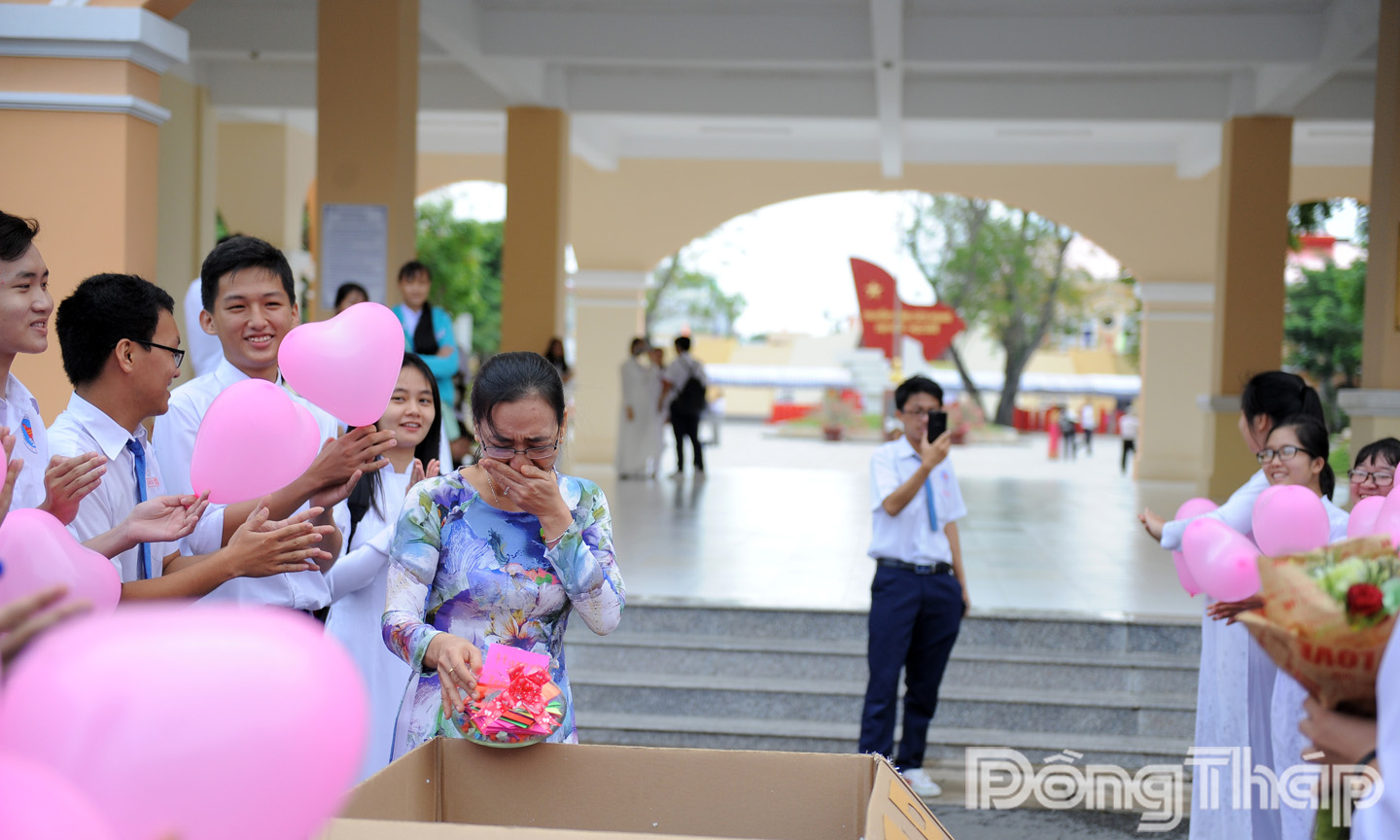 | Cảm xúc vỡ òa của cô giáo trước sự chuẩn bị món quà bất ngờ của học sinh dành cho mình. Ảnh: DUY NHỰT |