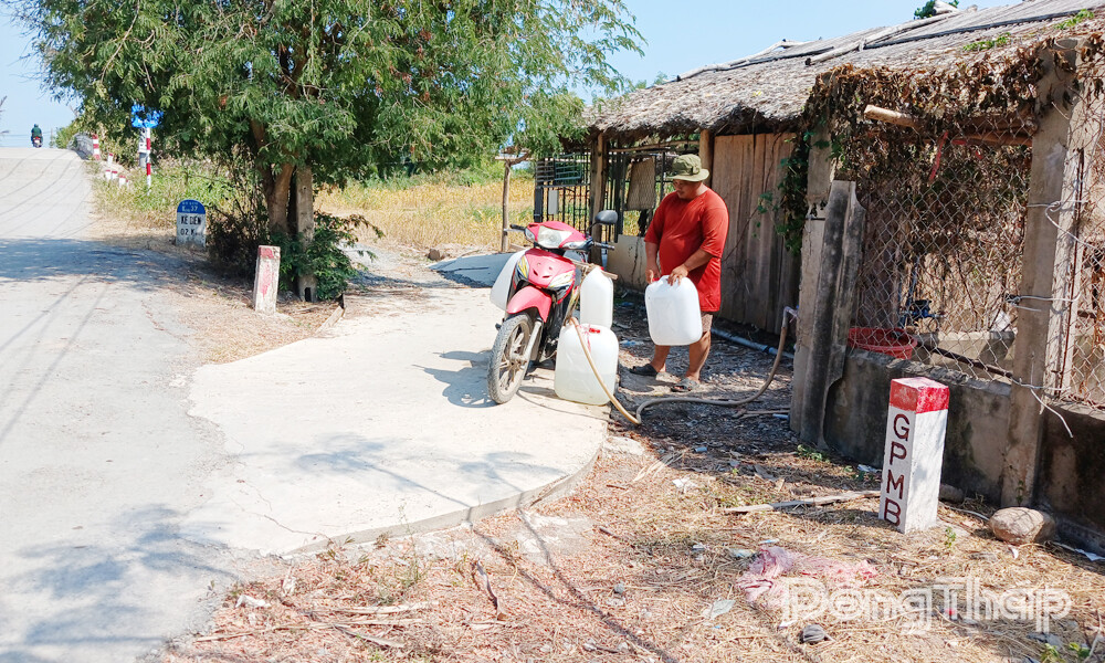 Vì vậy, mỗi mùa khô đến, gia đình phải dự trữ nước trong bồn, bạt. Ngoài ra, hằng ngày, ông còn mang can đến các điểm cấp nước miễn phí để lấy nước.