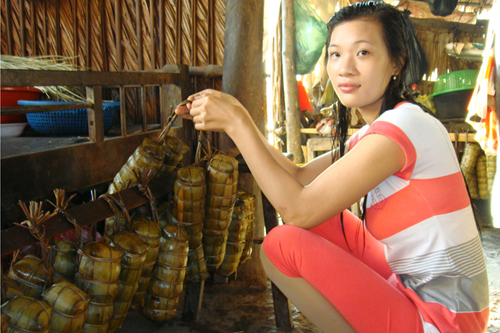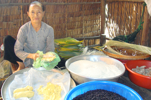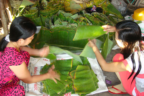 * Gói bánh tét với các nguyên liệu gồm nếp, đậu đen hoặc đậu xanh, thịt heo hoặc chuối chín...