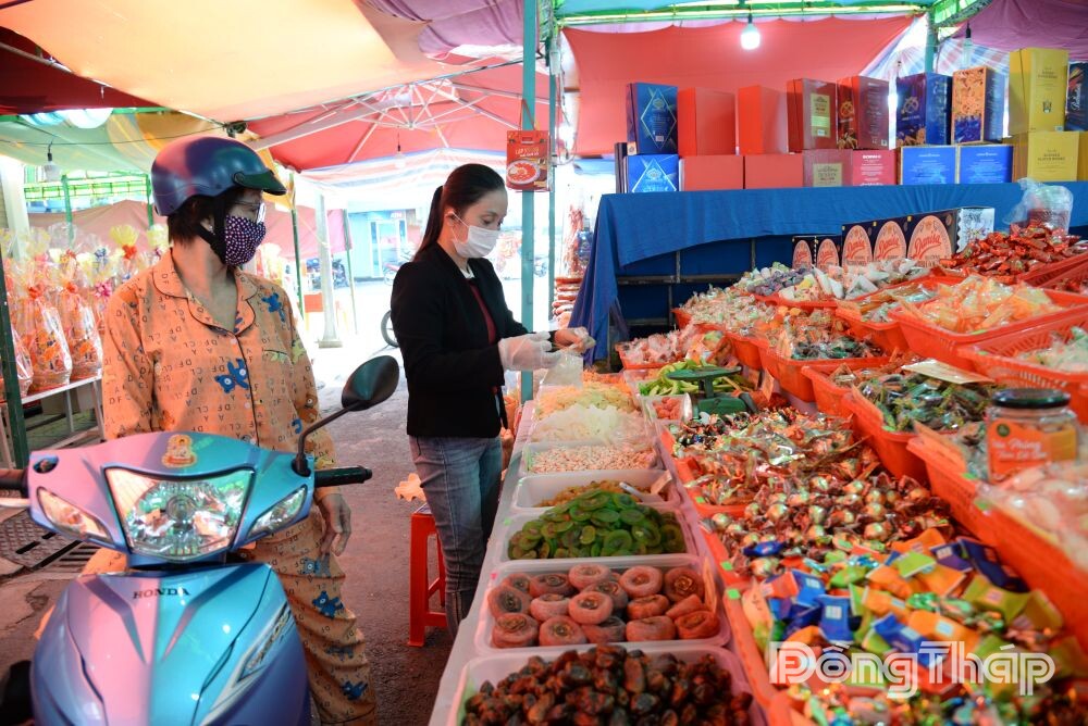 Các sạp hàng bày bán hàng hóa như: Mứt dừa, mứt gừng, mứt me, hạt dưa, hạt bí, bánh in, bánh pía, bánh kẹo truyền thống… rất phong phú, dồi dào.