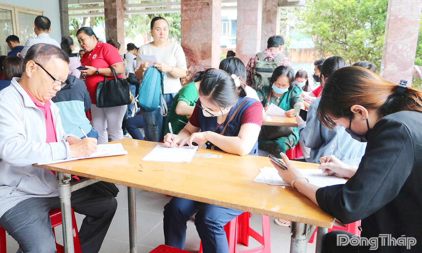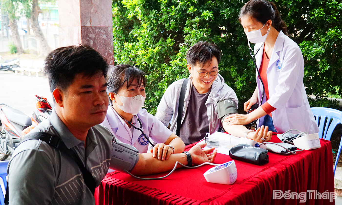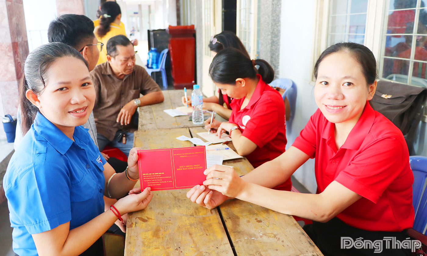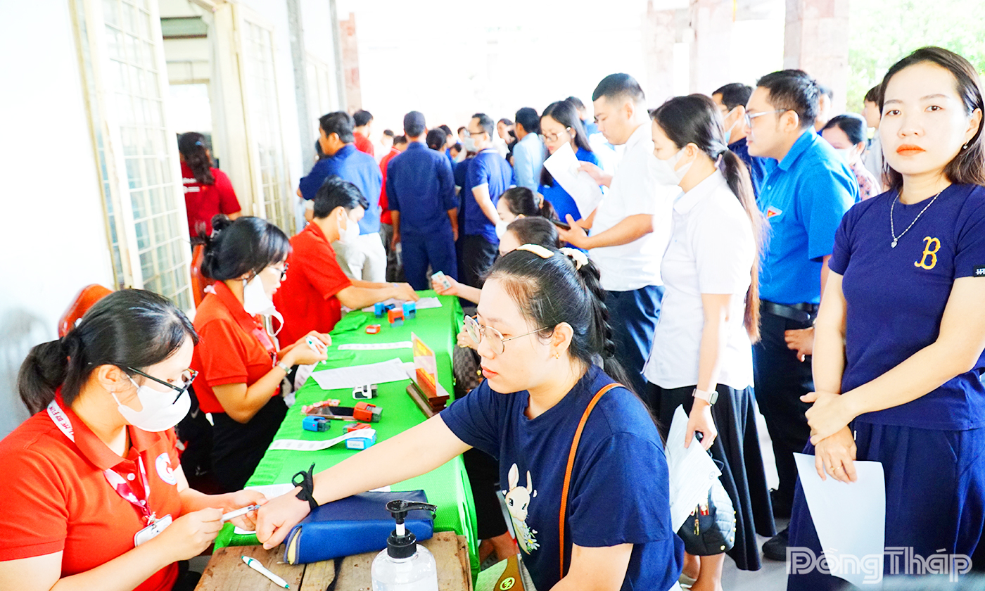 Cán bộ, đoàn viên, thanh niên và người dân ghi thông tin đăng ký hiến máu.Đo hyết áp, kiểm tra trước khi lấy máu.Kiểm tra thông tin và khám sàng loc trước khi lấy máu.