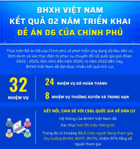 BHXH Việt Nam cho biết, kết quả 2 năm triển khai “Đề án 06 của Chính phủ”: Phát triển ứng dụng dữ liệu về dân cư, định danh và xác thực điện tử phục vụ chuyển đổi số quốc gia giai đoạn 2022 - 2025, tầm nhìn đến năm 2030. Đến nay, hệ thống của bảo hiểm xã hội đã xác thực được hơn 95 triệu thông tin. Trong đó có khoảng 86,6 triệu người đang tham gia các loại hình: bảo hiểm xã hội, bảo hiểm y tế, bảo hiểm thất nghiệp với tỷ lệ chiếm 97% tổng số người tham gia.
