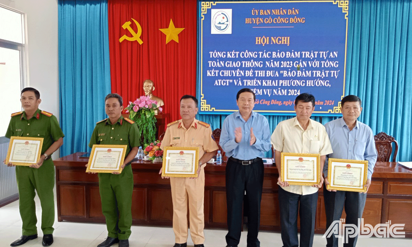 | UBND huyện Gò công Đông khen thưởng các tập thể và cá nhân hoàn thành tốt nhiệm vụ bảo đảm trật tự, ATGT năm 2023. |