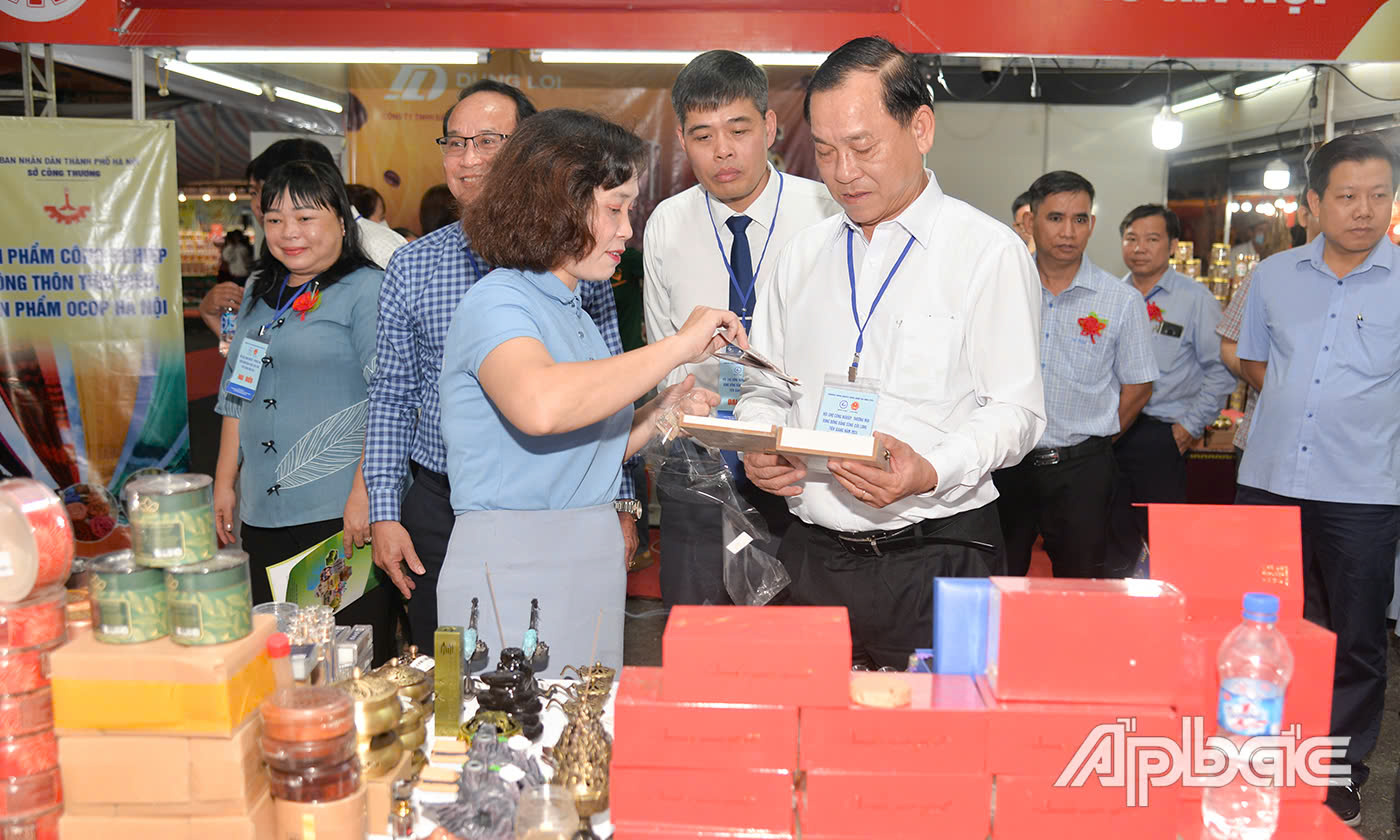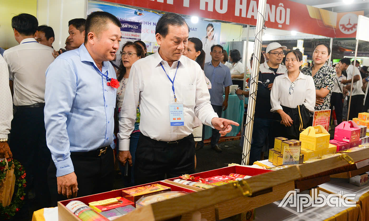 | Đại biểu tham quan gian hàng trưng bày sản phẩm nông sản của Hội Nông dân tỉnh Tiền Giang. |