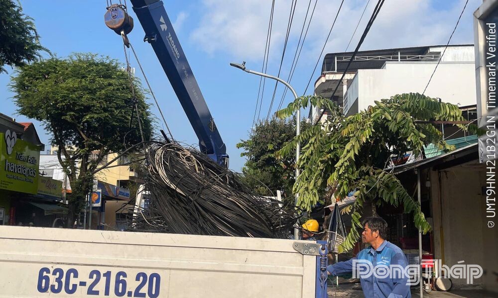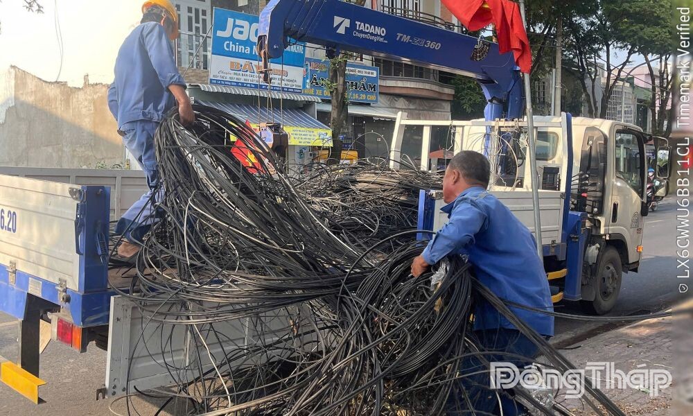 (ĐTO) Tiếp nhận phản ánh của người dân về tình trạng hàng chục đống dây cáp quang đã qua sử dụng bị bỏ lại trên lề đường Lê Thị Hồng Gấm (phường Thới Sơn, tỉnh Đồng Tháp) gây mất mỹ quan và cản trở giao thông, sáng 24-3, các cơ quan chức năng khẩn trương có mặt tại hiện trường, tiến hành thu gom, dọn dẹp, từng bước trả lại lề đường thông thoáng, sạch sẽ cho người dân.