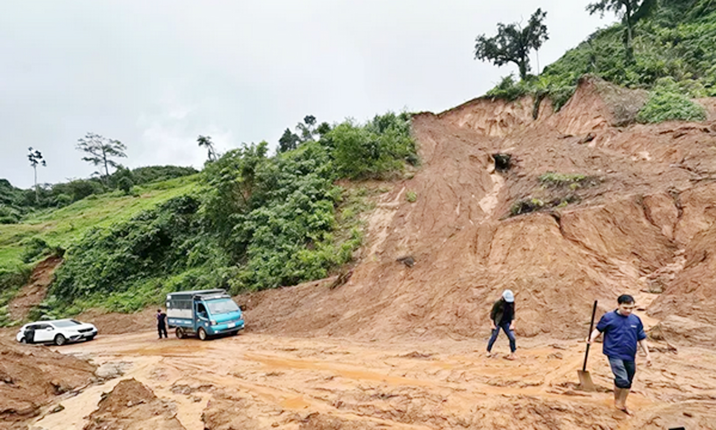 | Điểm sạt lở trên đường Hồ Chí Minh, đoạn qua xã Khâm Đức. Ảnh: HỒ CÔNG ĐIỂM |