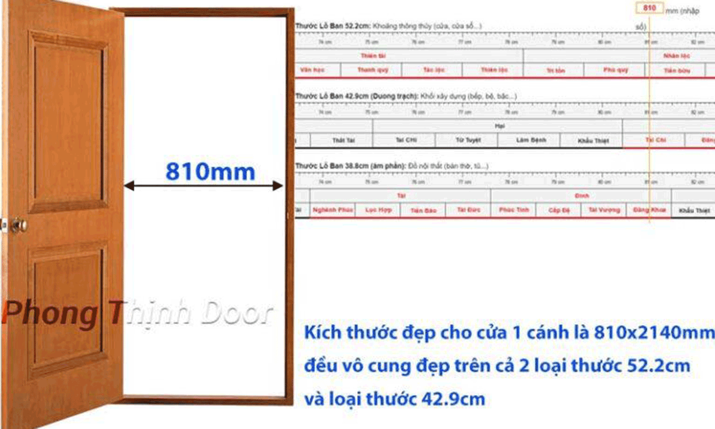 Chiều rộng thông thủy Tốt: 1501 mm - 1630 (cung tốt Tể Tướng, Quý Nhân), 1762 mm - 1890 mm (cung tốt Thiên Tài và Nhân Lộc), 2023mm - 2150mm (cung tốt Tể Tướng và Qúy Nhân), 2290mm - 2410 mm (cung tốt Thiên Tài và Nhân Lộc).