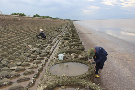 Đã nhiều lần trải nghiệm hành trình mưu sinh cùng người dân xứ biển Gò Công, chúng tôi vẫn tưởng những con hàu sần sùi, sắc lẹm như dao lam chỉ là các mảnh vỏ vô tri, vô giác. Nhưng đâu ngờ, nó là loài mang đến thu nhập cho người dân nơi đây. Không ai nhớ rõ nghề đục hàu lấy ruột ở đê biển Gò Công có từ khi nào, chỉ biết rằng khi đê biển được gia cố bằng bê tông là đã có hàu bám vào. Thoạt nhìn, nhiều người sẽ lầm tưởng đây là vô số mảnh vỏ nằm chen chúc lên nhau. Tuy nhiên, ít người biết rằng sự sống hằng ngày vẫn được duy trì nơi những mảnh vỏ này.