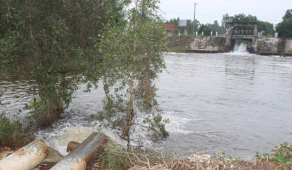 | Các điểm bơm chống úng ở huyện Tân Phước khẩn trương bơm dự phòng. |
