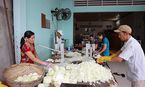 Nhân công cơ sở bánh mứt Thanh Nhàn (179C, đường Nguyễn Văn Giác, phường 3, TP. Mỹ Tho) tất bật làm mứt. |