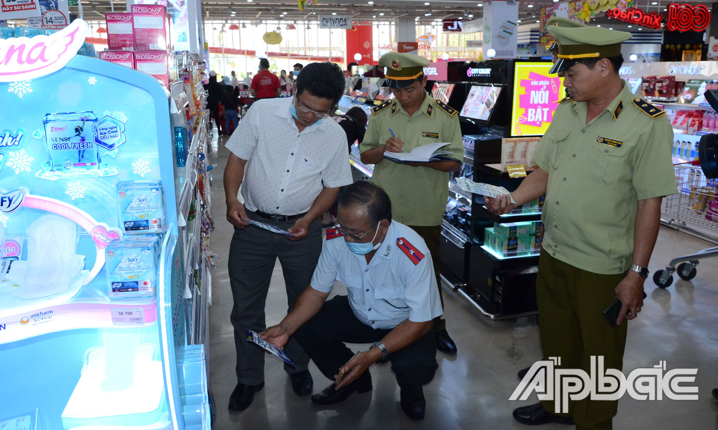 | Đoàn liên ngành BCĐ 389/TG kiểm tra việc bán khẩu trang tại Co.opmart Mỹ Tho. |