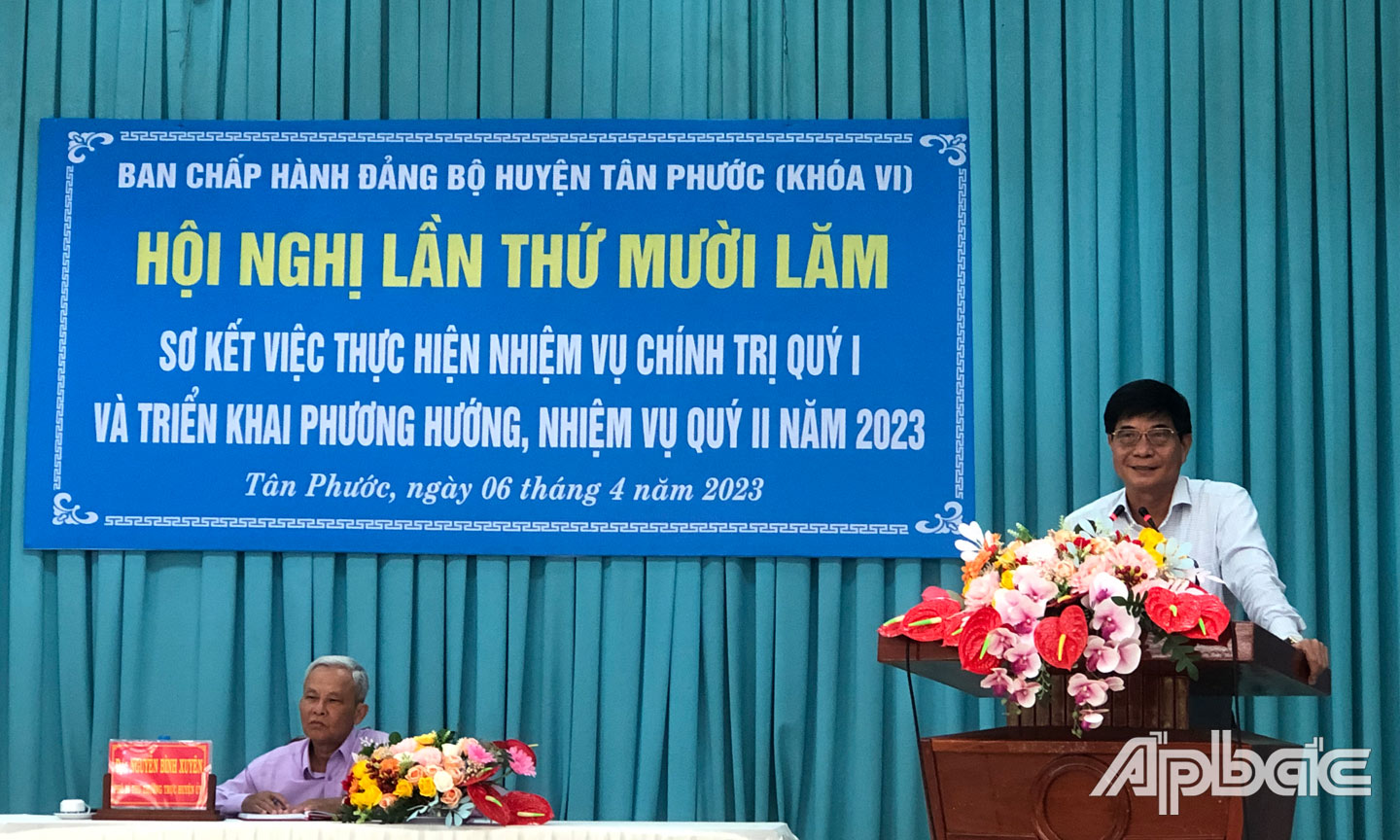 (ABO) Ngày 6-4, Huyện ủy Tân Phước, tỉnh Tiền Giang tổ chức Hội nghị sơ kết tình hình thực hiện nhiệm vụ chính trị quý I và triển khai chương trình công tác quý II-2023. Đồng chí Đoàn Văn Tuấn, Tỉnh ủy viên, Bí thư Huyện ủy chủ trì hội nghị.